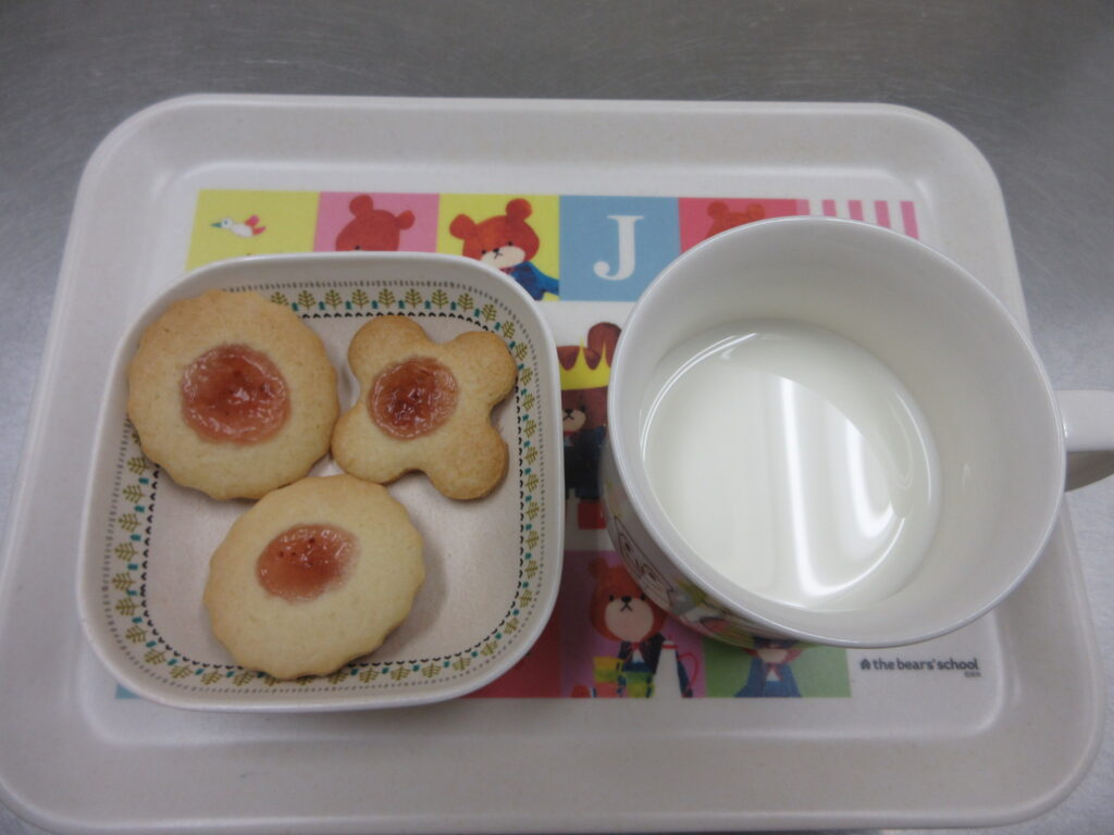 1月28日(水)・いちごジャムクッキー・・・お花の形にジャムをのせて焼いた可愛らしいクッキーです。